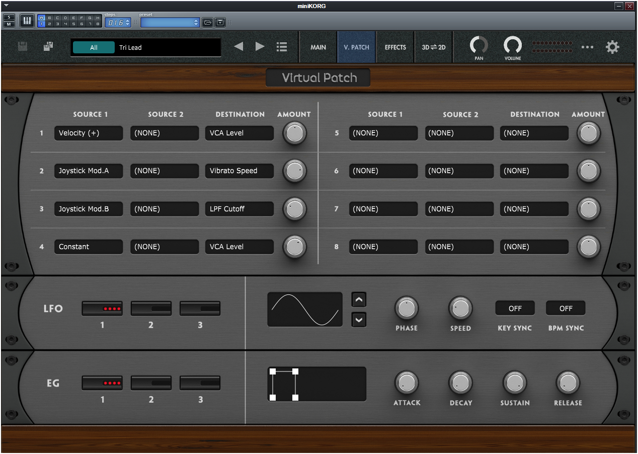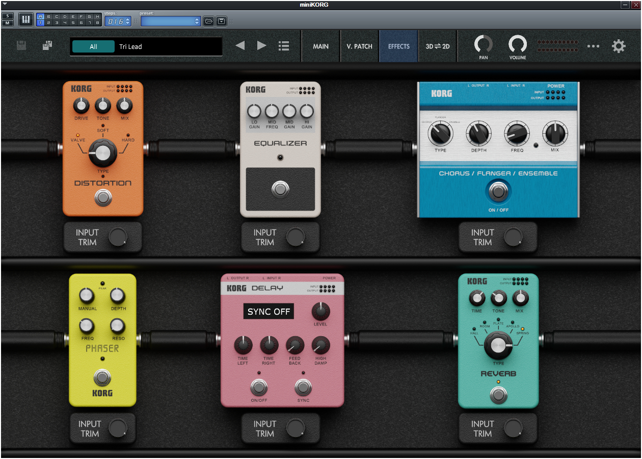 VSTI 버전의 미니코르그는 그 인터페이스를 보면, 해당 신디사이저에 외부 이펙터를 죽 연결해놓은 화면이 마치 Arturia의 아날로그 신디 VSTI를 보는 듯 하다.