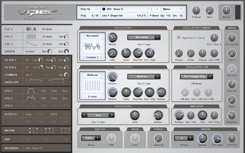 또한 VIPER에서는 VIRUS의 웨이브폼을 포함하고 있으므로 이렇게 VIRUS의 뱅크를 읽어들여서 연주를 해보면 대단히 흡사한 소리가 난다.