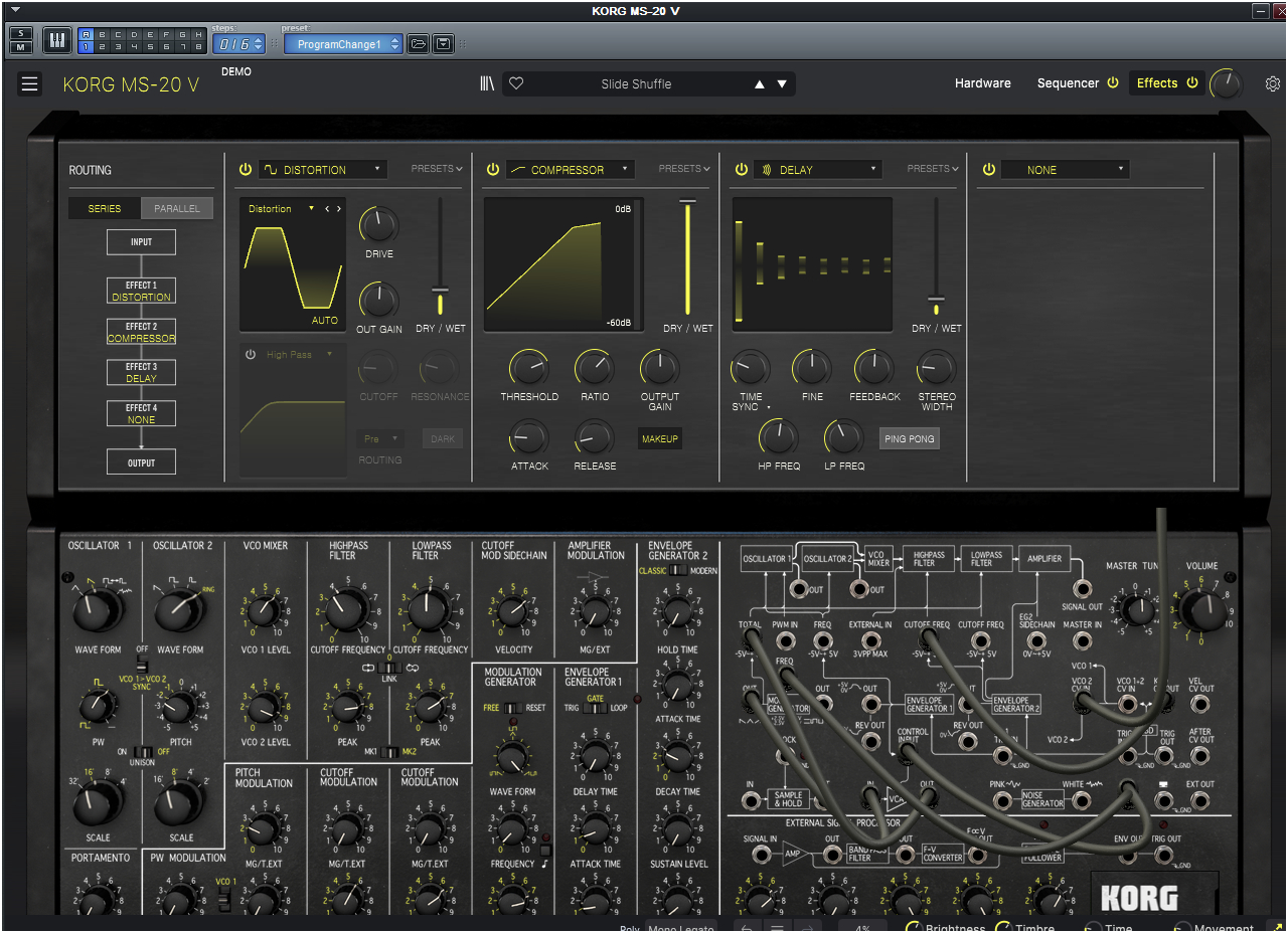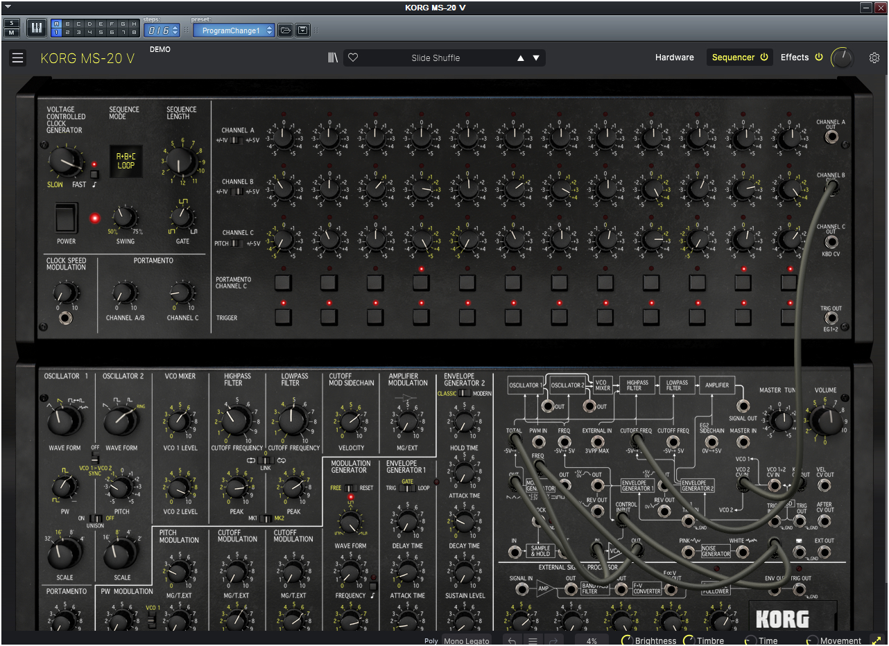 SQ-10은 3채널 / 12스텝의 아날로그 시퀀서인데 Arturia는 MS-20V에 포함시키면서 기본적인 H/W 연결에 대한 부분은 생략하고 이미 MS-20과 SQ-10이 연결되어 있다는 전제하에 ON/OFF로 간단히 그 기능을 연결하고 끊을 수 있게 만들었다. 즉 위에서 설명한 Cherry Audio의 PS-20처럼 기본적으로 CV/GATE 및 추가연결을 통해서 두 모듈을 연결시킬 필요가 없이, 각각의 채널에 출력값으로 연결되는 것만 패칭을 하면되는 스타일로 만들었다. 물론 실제로 MS-20과 SQ-10을 기본적인 단계부터 연결하는 것을 에뮬레이션할 수도 있겠지만, 굳이 SQ-10을 별도의 플러그-인으로 만들어 모듈러 방식으로 연결하게 만드는 것이 아닌 다음에는 이 방식도 좋은 선택이라는 생각이다.