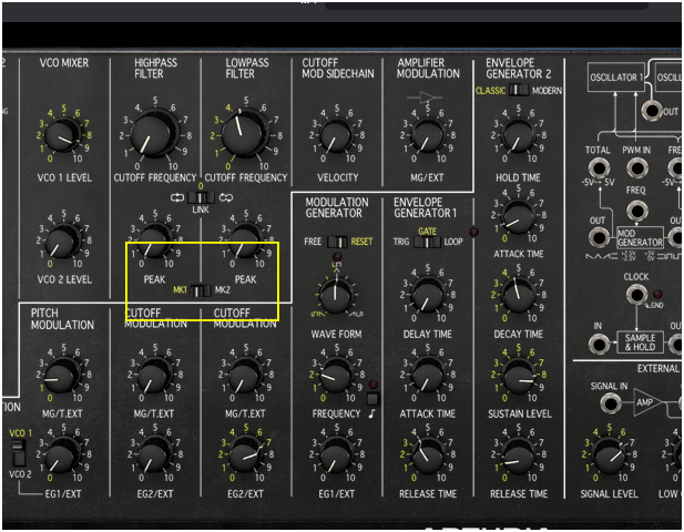 Arturia 개발진이 밝힌 바 있듯이, MS-20V에서는 MS-20의 필터 모델링에도 많은 정성을 기울였다고 하며, 실제 MS-20과 마찬가지로 초기형과 후기형의 2종류의 필터 특성을 재현해놓았다. 아래 사진의 노란 박스안에 보면, MK1하고 MK2하고 레터링이 되어있는 스위치가 보일 것이다.