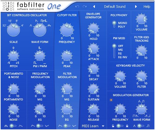 이 Fabfliter One은 인터페이스나 구성이 MS-10을 쏙 빼어닮아있고 필터라든가 사운드 특성도 MS-10과 대단히 유사하다. Fabilter One은 심플한 구성에도 불구하고 질 좋은 필터 및 사운드를 구현하고 있는 걸작 VSTI중의 하나이다. 필자가 대단히 좋아하는 VSTI이기도 하다.