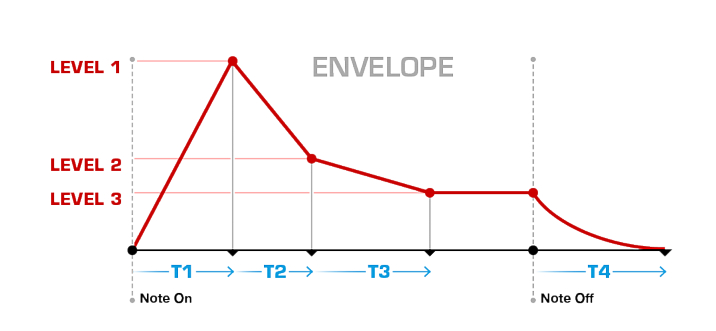 통상적인 ADSR과 달리 레벨 패러미터가 추가된 이러한 envelope설정이 처음에는 복잡해보이겠지만, 이를 조합해 사용하면 독특한 엔벨로프를 만들어낼 수 있고 통상적인 ADSR로는 만들기 어려운 소리를 만드는데에도 효과적이다. 그리고 이후에 나온 JD-800에서도 알파 주노와 동일한 envelope 타입이 사용되었다. 이러한 다단계 envelope를 이해하는 가장 빠른 방법은 이미 만들어진 프리셋을 로딩해, 이 패러미터를 만져보며 사운드의 변화를 들어보는 것이다. 이 편이 ADSR과 각 레벨과의 상관관계를 설명하는 것보다 훨씬 더 효과적일 것이다. 아래는 AudioRealism사의 ReDominator 페이지에 있는 엔벨로프 참고그림이다.