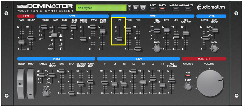 ReDominator와 Alpha Juno 신디사이저의 특징적인 것 중 하나가 HPF, 하이패스필터의 패러미터인데 총 4단계로 나위어져 있다. 매뉴얼에도 잘 설명이 되어 있는데, 여타 아날로그 신디사이저들의 HPF와는 좀 다른 설정으로 되어 있어 이 점을 미리 알아 둘 필요가 있다. 통상적인 HPF 필터는 ON/OFF에 이어서 프리퀀시 레벨을 점진적으로 설정할 수 있게 되어있는데, ReDominator와 Alpha Juno의 경우는 총 4가지 단계로 사용할 수 있으며 2, 3단계는 통상적인 HPF의 레벨인데 유의할 것은 0,1 레벨이다.