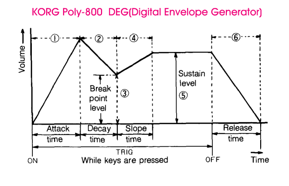 요즘 여러 VSTI에서 구현되고 있는 MSEG(Multi Stage Envelope Generator 또는 Multi Segment Envelope Generator )의 효시격이라고도 할 수 있는 이러한 다단계 Envelope는 80년대 당시 보편적인 것은 아니었지만, Alpha Juno보다 2년 정도 더 일찍 나왔던 Korg사의 Poly-800 같은 경우도 Alpha Juno와 마찬가지로 Korg가 야심차게 디지타이즈된 컨트롤 계통을 채택한 경우였고 Envelope도 디지털화된 것의 특징을 나타내기 위해 DEG(Digital Envelope Generator)라고 이름을 붙인 6단계의 Envelope를 사용한다(통상적인 ADSR의 Decay와 Sustain 사이에 Slope와 브래이크 포인트 레벨을 추가).