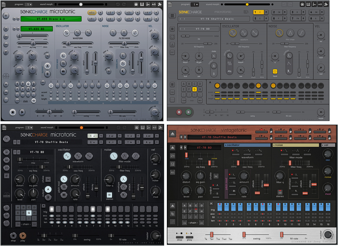 이 보너스 프리셋 패키지는 매우 큰 이점이라는 생각이다. 뮤지션들이, 그것도 현재 일렉트로닉 팝씬을 리드해나가고 있는 스웨덴 출신 일렉트로닉 뮤지션들이 만든 (그리고 자신들의 작품에도 사용하는..) 프리셋이라는 점이 말이다. 프리셋이나 프로그램을 죽 들어보다 보면 참.. 아이디어들 멋지구나..하는 감탄이 절로 나온다. 최근에는 Vintage Tonic이라고 해서 전설적인 드럼머신 명기 10종의 들의 사운드를 모델링한 프리셋팩이 나왔다. 이름과 사운드를 들어보면 바로 아.. 이거구나할 정도로 직관적이며(예를 들면, VT-78. 이건 Roland CR-78) 그 악기들의 특색을 잘 구현한 프리셋 팩이니 Microtonic 정품유저는 꼭 다운로드 하길 권한다. 여담이지만 한 때 필자도 CR-78 소리를 좋아해서 그 소리 구현하는 데 열중인 적이 있었다.