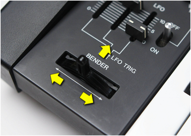 Juno-106의 휠/스틱은 스틱하나에 피치 벤딩과 모듈레이션 기능을 묶어 놓았다. 그래서 좌우로 밀면 피치 벤딩. 휠을 앞으로 좀 밀면 그 미는 정도에 따라 모듈레이션이 적용된다.